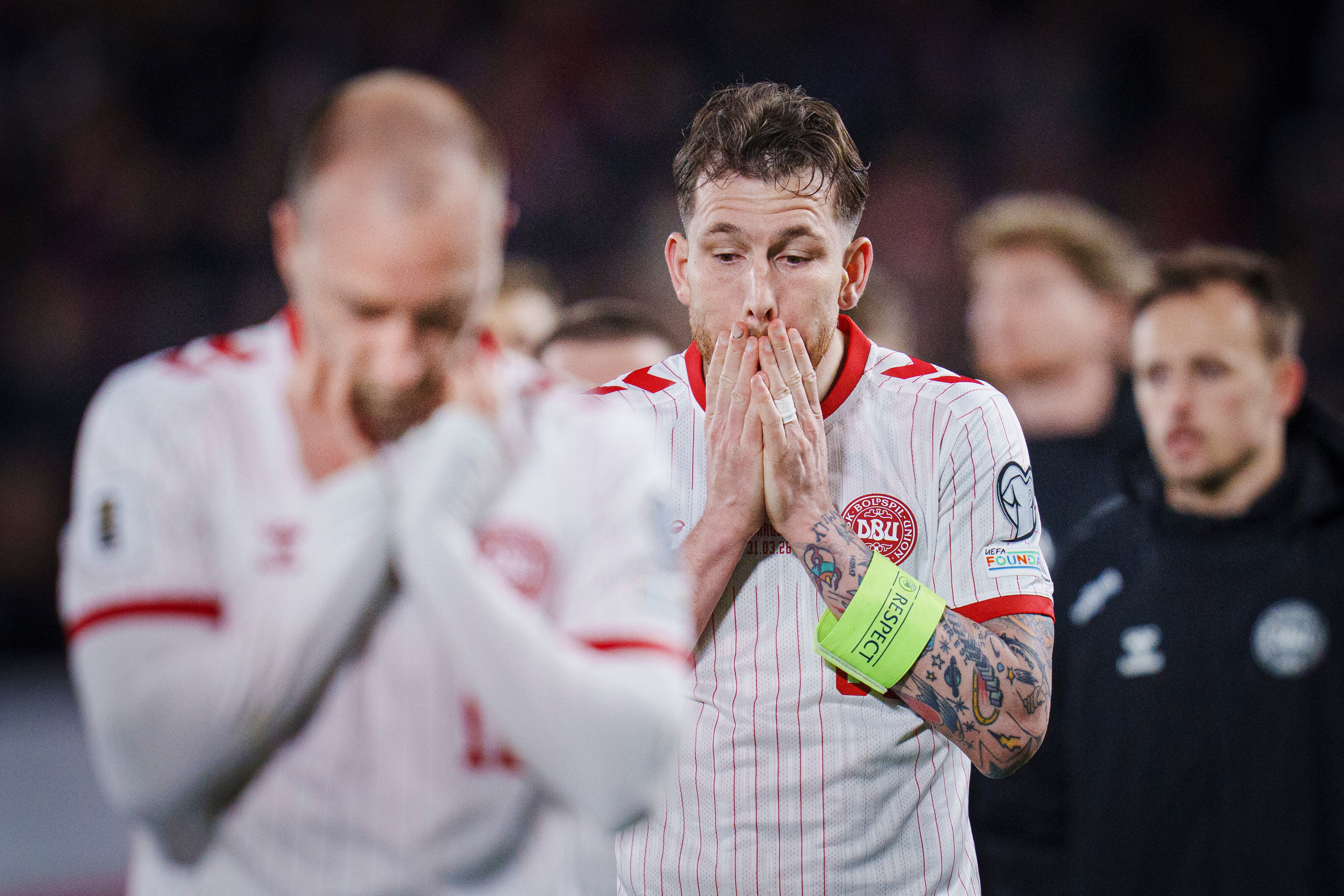 3月31日,丹麦队球员霍伊别尔(右)和埃里克森在点球大战后。新华社/美联